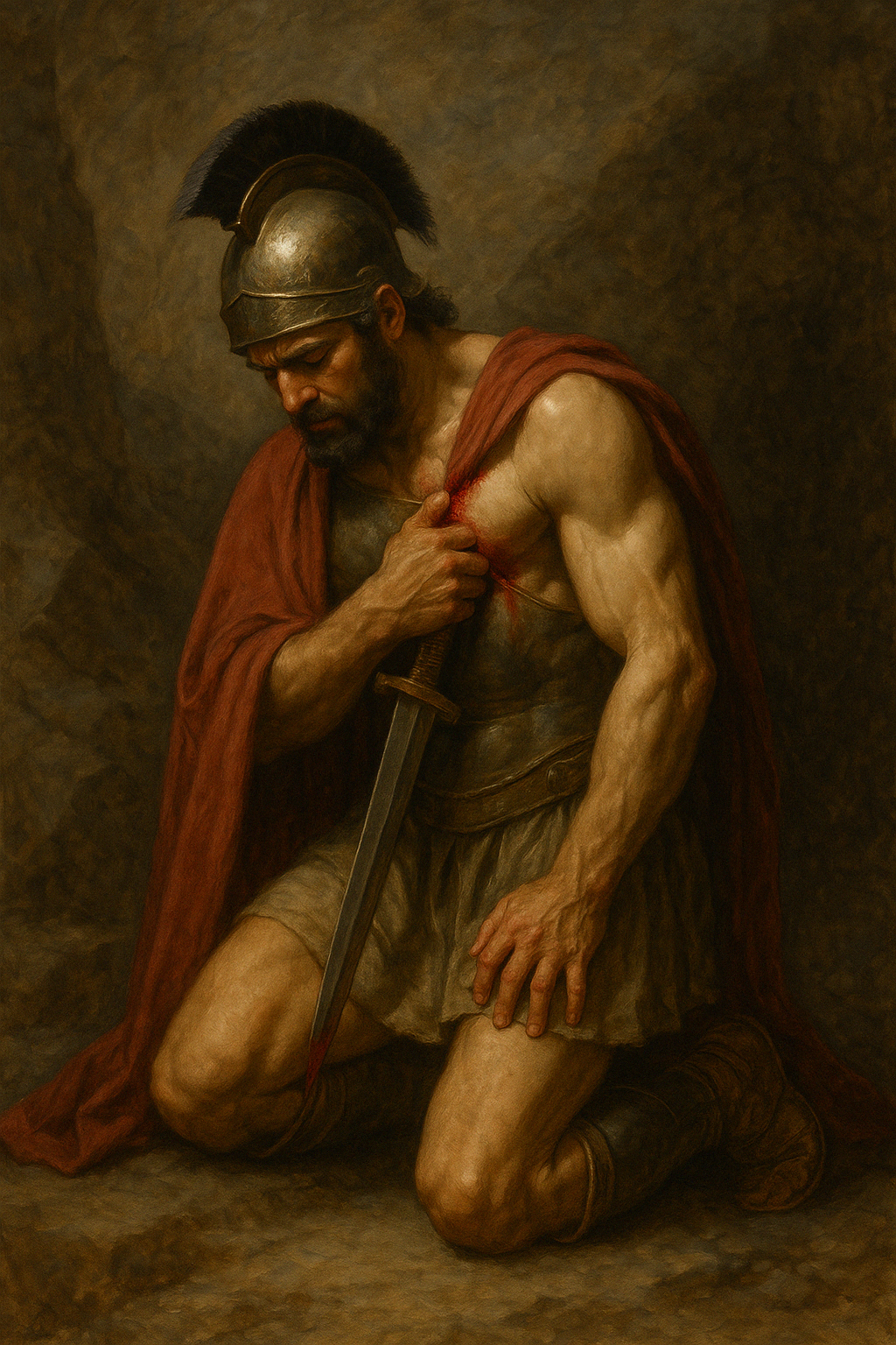 Lì, piantata la spada nella sabbia con la punta rivolta verso l’alto, Aiace si gettò sopra, trafiggendosi proprio sotto l’ascella, l’unico suo punto vulnerabile.