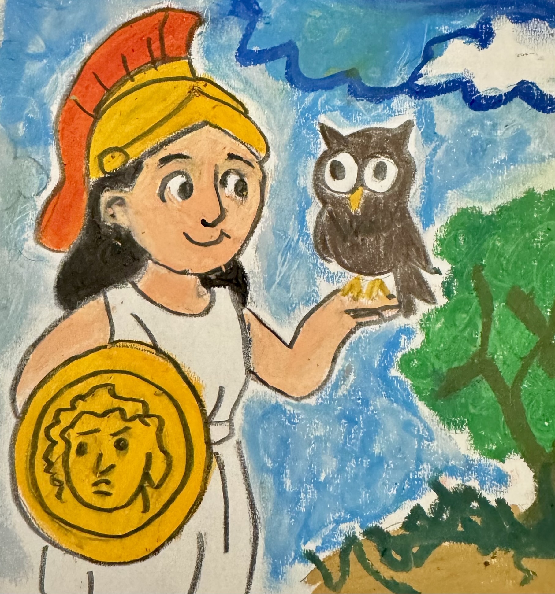 Disegna Atena con la sua civetta e lo scudo Egida! Aggiungi anche un olivo carico di frutti per ricordare il suo dono agli uomini.