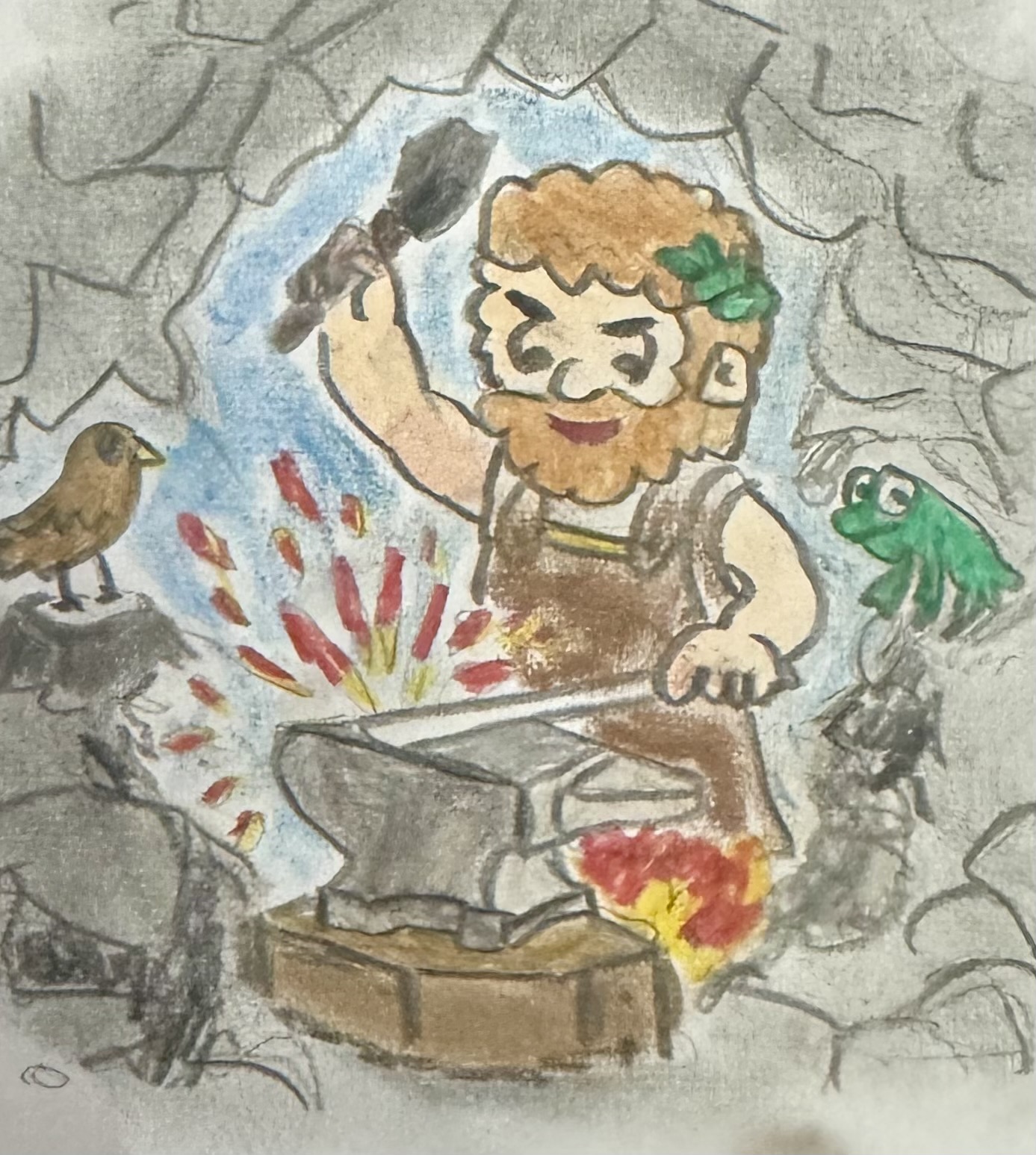 Disegna Efesto nella sua fucina! Aggiungi l’incudine, le scintille, il martello e qualche creatura della montagna che lo osserva curiosa!